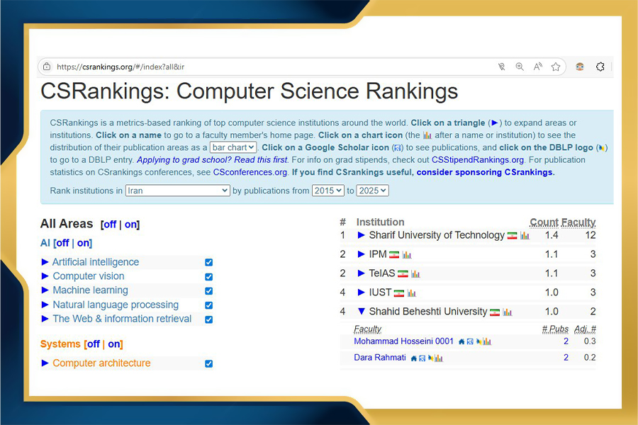 دانشکده مهندسی و علوم کامپیوتر دانشگاه شهید بهشتی در جمع برترینهای رتبهبندی بینالمللی CSRankings قرار گرفت
